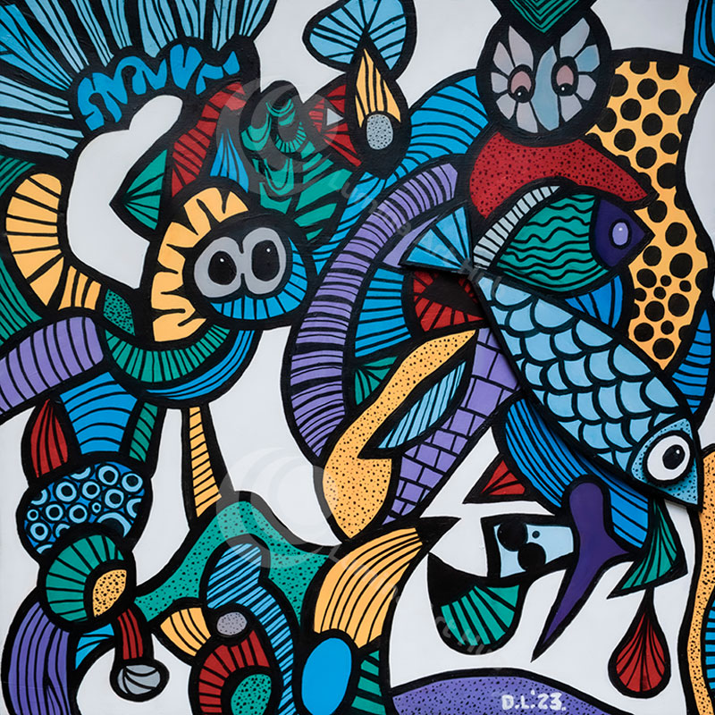 A lively deep ocean scene with a blue fish and other sea creatures.