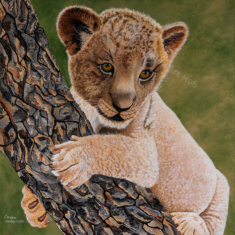Show your love for lions and nature with this adorable original painting of a lion cub climbing a tree. The painting depicts a cute and playful scene of a lion cub trying to reach the top of a tree, while his mother watches over him. The painting has a realistic style, with vivid colors and fine details. You can see the fur, the claws, and the expressions of the lions.