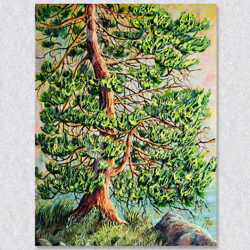 This painting transports us to the serene lake shore, where the company of a towering pine tree sets the scene for a tranquil day. This magnificent tree dominates the canvas with its expansive, light green foliage, its thick and twisted branches sculpted by the persistent breezes and winds from the lakeside. The sky overhead is painted in a gentle light yellow, allowing glimpses of the light blue waters of the lake to peek through, creating a harmonious and peaceful lakeside vista.