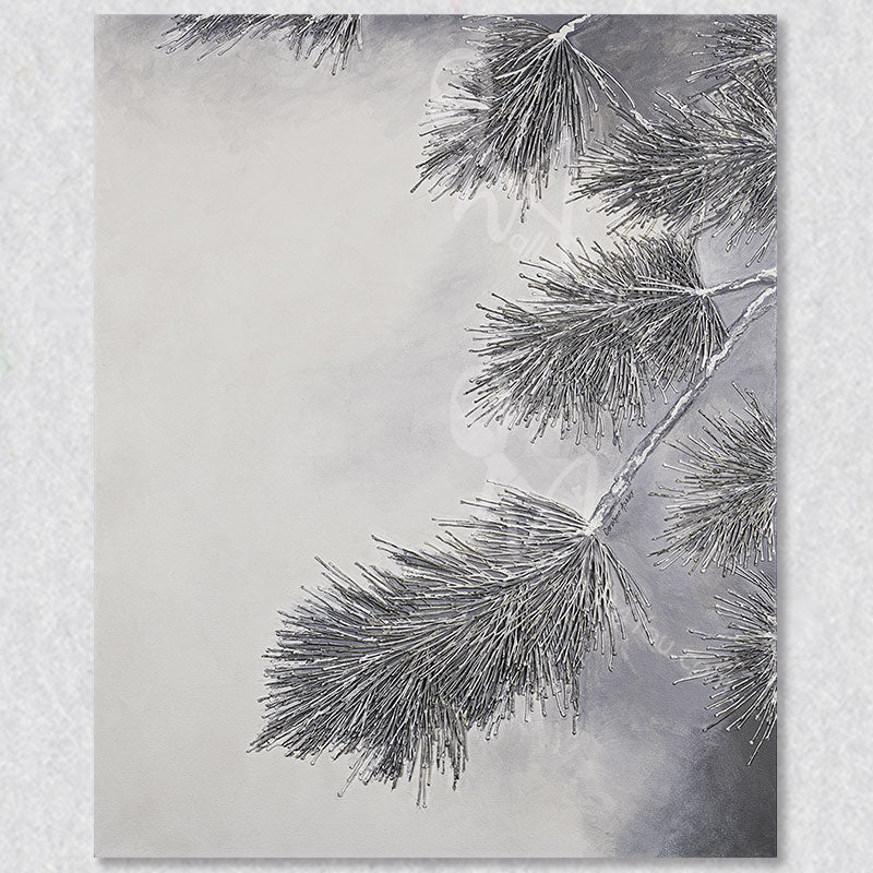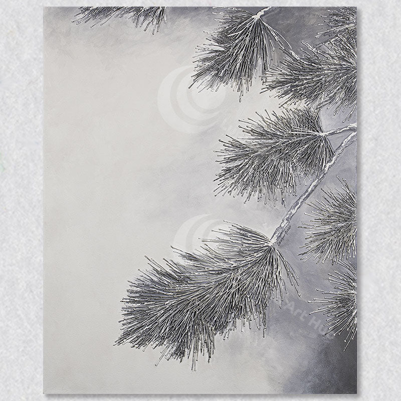 "Serene" by artist Carolynn Ashley is a close-up painting of a pine tree's branches, skillfully capturing the intricate details of the pine needles. Through the use of texture, Ashley brings a stunning three-dimensional quality to the artwork.