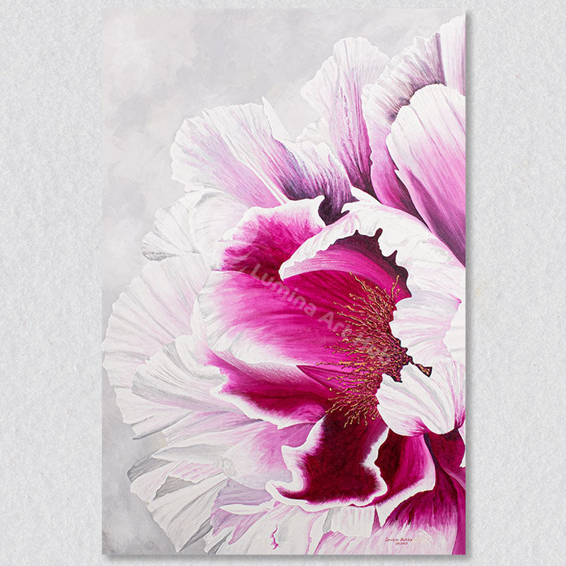 The deep pink peony in "Tranquility" is a vision of grace, with petals so highly detailed and fine that they exude a sense of tranquility. Against the soft grey backdrop, the flower becomes a focal point of sophisticated beauty. The canvas print ensures a faithful reproduction of the intricate details, offering a high-quality addition to your wall art collection.